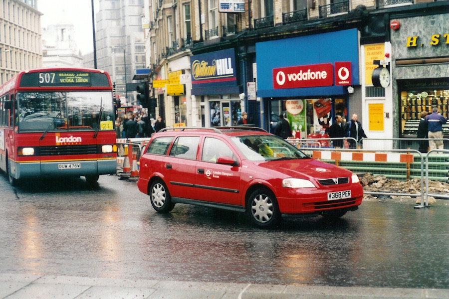 | Details: As at April 2000, the Vauxhall Astra was the most numerous car model in the central fleet, a position usually held by Ford. The numbered fleet included 22 estates (plus a single hatchback), most of which were in LUL white/blue livery. Exceptions were four used by London Transport Buses, of which three were in all white (like 4689B). The newest of the LTB Astras was 5041B, delivered in January 2000 in red livery, though it never received the orange squares carried by other LTB vehicles. Strangely, three further red Astras were delivered later in 2000 and did get the squares, as seen on 5059B. 5041B was often to be found at Finsbury Park Bus Station, but was also a common sight around central London. On 3rd April 2000 Colin caught it on the one-way system around Victoria Station. I have left this photo cropped wide as the bus on the left is of some interest. This is one of the 69 Leyland National IIs built for use on the Red Arrow network in 1981. 42 of these buses were rebuilt by East Lancashire Coachbuilders in 1993/1994 to their 'National Greenway' specification. This included the fitting of new exterior panels and windscreens which changed the buses' appearance considerably. They were eventually replaced by new Mercedes-Benz Citaro articulated buses in 2002. | |||