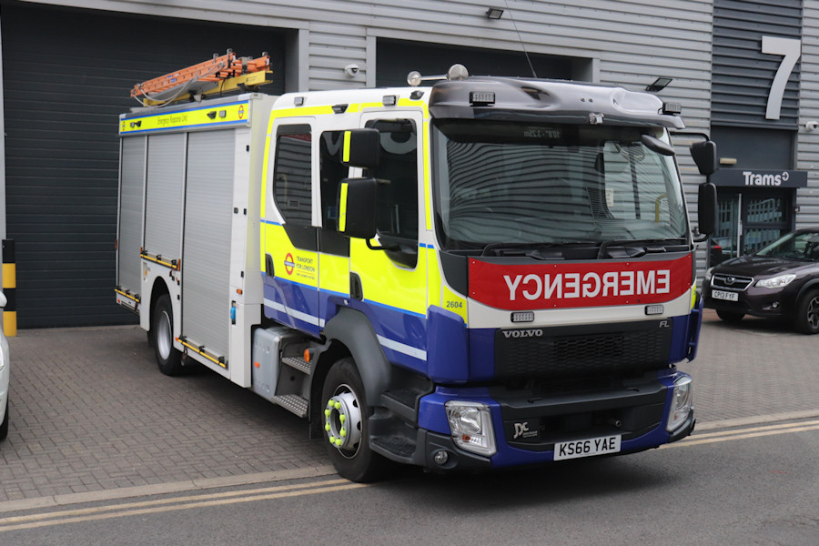 | Details: Another view of Volvo FL emergency tender 2604 parked outside Battersea ERU depot on 11th June 2020, and I draw your attention to the fact that the adjoining unit in this small industrial estate is used by 'Trams'. Sadly this is just the name of a 'Trusted IT Solutions Provider' (to quote their own website). Turning back to the main subject, I noticed there was a small grey object in the middle of the sunvisor (above the windscreen) that appears to be pointing downwards. Further inspection showed that there were similar devices at the mid-points of each side and the rear. I suspect that these are small video cameras. There was a trial a few years ago with similar cameras on some London buses. The camera feeds were composited into a single image, effectively giving the driver a bird's-eye view of whatever was close to their vehicle. Useful when manoeuvring in confined spaces. | ||||