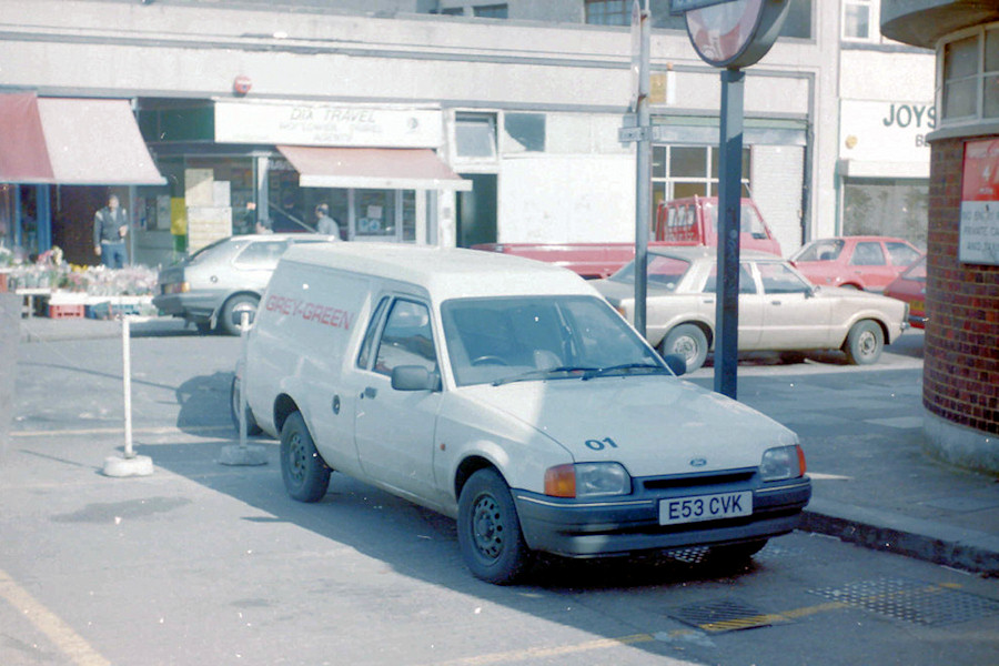 | Details: Grey-Green was a long-established coach operator with several bases in London and East Anglia. Bought by the Sunderland-based T Cowie group in 1980, seven years later it started operating bus services under tender to London Regional Transport. Route 298 between Turnpike Lane and South Mimms was taken over in February 1988, which probably accounts for the presence of Grey-Green Ford Escort van E53CVK at Turnpike Lane in 1989. The van was first licensed in November 1987 so was probably operated from new. Many of the early service vehicles were registered in Newcastle, due to the T Cowie connection. E53CVK (with the distinctive fleetnumber 01) was last licensed until August 2002 but, with no more photographs or sightings to refer to, it may well have been withdrawn some time before then. An interesting aside to this photo is the 'Dix Travel' sign on the shop in the background. Dix Coaches was taken over by Grey-Green in 1976 but was retained as a company and trading name for some time, including appearance on at least a couple of tendered bus routes. The Barking/Dagenham garage currently operated by Arriva London was opened in 1992 to replace the Manchester Way premises of Dix Travel, and this connection is preserved in the location's code of DX. | ||||