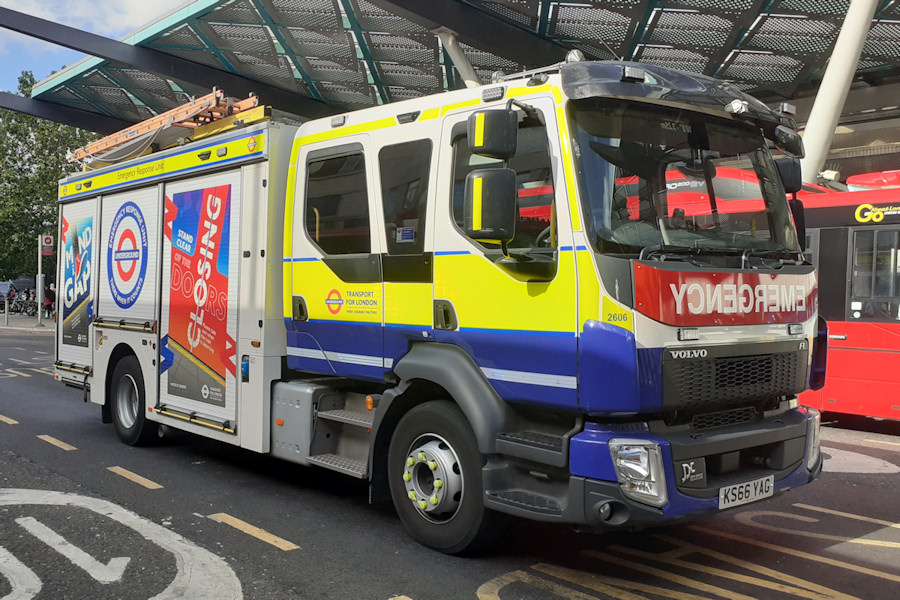 | Details: An incident on the Victoria line on the morning of 6th July 2020 resulted in the attendance to Finsbury Park of two Emergency Response Unit tenders. This fine view of TfL-liveried 2606 shows the extra brandings applied to the roller shutter doors, believed to be in connection with its participation in the Lord Mayor's Show in November 2019. The other tender present was BTP-liveried 2612. | ||||