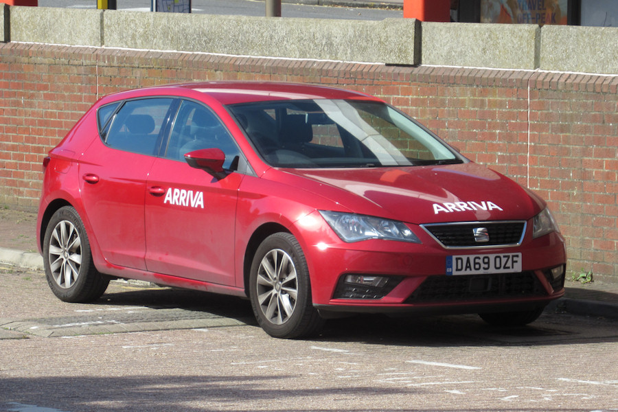 | Details: The Spanish company Seat has never been very well represented in the service vehicle fleets. Abellio and Arriva the Shires between them mustered six cars, though all were withdrawn by 2018. More recently Arriva London's Dartford garage has acquired a taste for the make. Four Leon hatchback cars were delivered around the end of 2019, three of which carried Arriva fleetnames (without the usual accompanying logo). This is seen on DA69OZF at Eltham Bus Station on 13th July 2020. Two very similar Seat Ibiza cars in gold livery had arrived earlier in 2019 but have not been noted recently and they may have migrated across the river to the Grays operation. | ||||