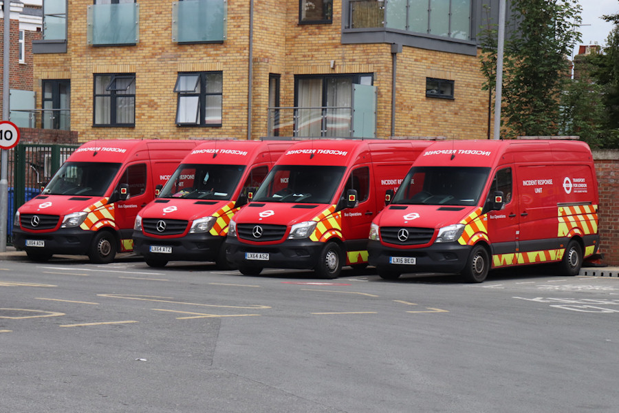 | Details: Though 23 of the new Volkswagen Incident Response units were delivered and put into service before the COVID-19 lockdown, they were not spread evenly around London. Of the main locations used, Eltham got five of the new vans and Morden four, each representing over half of the vans allocated. Turnpike Lane however only got one (9058VW), meaning that the allocation there is still dominated by the previous generation of Mercedes-Benz Sprinters. Seven of the red vans (and the sole white one) were present when Derek visited on 14th July 2020, this view showing a neat line-up of (left to right) 7877M, 7868M, 7865M and 7850M. 7850M and 7877M had been based here for most of their 5-year lives, while 7868M seemed to float around all over the place, perhaps being a 'cover' vehicle. 7865M was a Stratford City resident until replaced by new Crafter vans in February. | |||||||