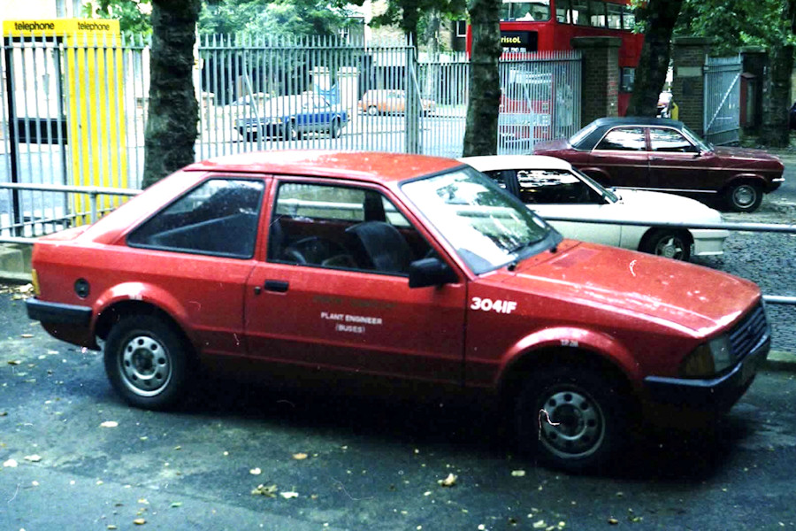 | Details: The new fleet numbering series for leased vehicles was started in 1982, with numbers in the range starting from 3000. Thirty vehicles arrived before the change from X-suffix to Y-suffix registrations in August 1982, these being allocated numbers between 3019L and 3114L, other numbers going on Y-plated vehicles. The thirty X-regs included four Ford Escort 3-door hatchback cars, a type which was never as common as the estate version. 3041F was one of the four, and replaced similar 2112F with the Plant Engineer at Stamford Hill Garage. It was photographed at its home garage in August 1986, a couple of months before it was returned to Hertz off lease. Apart from wondering what the 'Plant Engineer (Buses)' actually did, a couple of points about this photograph caught my eye. The first is the telephone box in the left background. The telecomms market had recently been opened to competition but I don't recall seeing boxes of this type before. The other point is the MCW Metrobus parked outside the garage entrance. The M class was the standard type in this area at the time, but this example appears to have a non-standard silver front grille. It also seems to have the word 'Bristol' (in a curious font?) in the front blind via-points box, with the destination being a more mundane Ponders End. | ||||