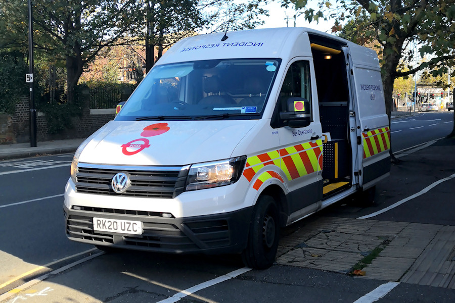 | Details: Many of the Incident Response Unit vans operated by London Buses gained poppy stickers on their fronts in late October and early November, there being space on the bonnet to place these above the normal roundel. This view of 9070VW at Busch Corner in Isleworth on 4th November 2020 shows this, and also the side door in the open position. It is known that for this role, vans with full-height doors are preferred, which may explain why Ford Transits are not currently favoured. | |||