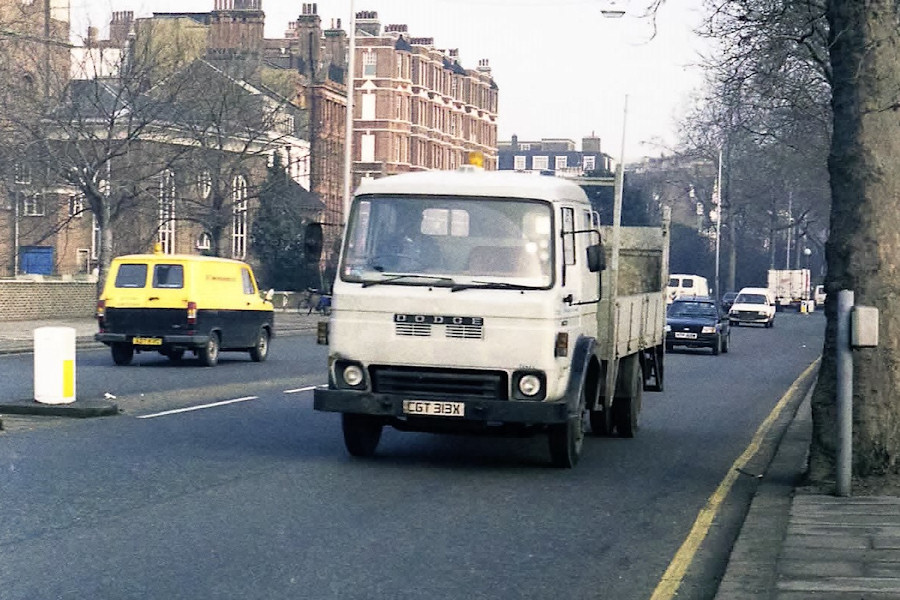| Details: Dodge Commando lorry 2313D was caught coming along a quiet Chelsea Embankment in February 1987. The London Transport lorry fleet became more interesting in the early 1980s, although the plain grey livery remained standard. After years of relying on the Ford D series, some examples of the replacement Ford Cargo model were bought but there were also quite a few Bedford, Dodge and Leyland types as well. 2313D had been new in late 1981, allocated to Neasden Depot and appears to have been fitted with a tail-lift in about 1984. It was sold in 1988 and was last licensed in 1991. | |||