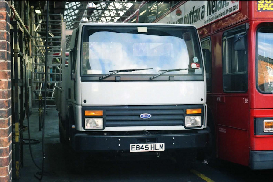 | Details: Four Ford Cargo 0811 dropside lorries were bought in 1988 and given fleetnumbers 2465F to 2468F. For some reason they do not seem to have been photographed much, and I have never seen pictures of 2466F or 2467F. The only image of 2465F that has come to light is this one of it parked in Walthamstow Bus Garage in April 1988. Walthamstow was usually home to quite a lot of service vehicles because, like Stockwell, it was used by Distribution Services as an outstation. While SW was virtually my local at the time, I think I only visited WW once, in about June 1983. The only allocation information available for 2465F shows that it was based at Acton Works by June 1990. Also unknown are the disposal dates for this quartet, though I suspect they all went in the early 1990s, giving them a very short working life. Apart from seven Routemaster trainers, the bus allocation of Walthamstow at this time was made up entirely of Leyland Titans (about 83 in total) like T316 parked alongside. According to my notes, during my 1983 visit the garage contained eleven service vehicles and two preserved RFs, in addition to seventeen Titans and one each of RMA and RMC. | ||||