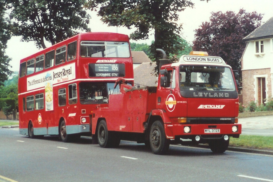 | Details: Leyland Freighter bus recovery truck 2372L has appeared on LTSV several times, but this photo shows it in an intermediate livery not seen before. New in 1982 as the first of a new generation of tow trucks, 2372L spent most of the decade based at Cricklewood Bus Garage. The photo here was probably taken in 1989 or 1990, following the introduction of the 'tape-grey' livery (as carried by the MCW Metrobus being towed) at the end of 1987. 2372L had lost the Cardinal District label from its front, replaced by the logo of newly-formed bus operating unit Metroline (applied in about February 1989), while the plain white roundels on the sides have been changed for the latest white/red/yellow London Buses ones (this occurred after March 1989). The lorry had also switched to its originally-booked registration of MYL372X, having initially operated on trade plates, and had gained a pair of additional front lights below the bumper. Interestingly, it still carried the unique 'Fleet No 2372L' lettering it had from new. This livery was not to last long and, by August 1991, 2372L had been transferred to LUL at Acton Works, repainted into white/blue and given the incorrect fleetnumber 2372M. | |||