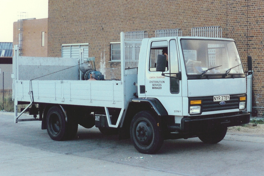 | Details: If 2373F was the 'prototype' for the Ford Cargo with London Transport, then 2378F shown here represents the first 'production' batch. Seven were bought in spring 1983, comprising two further artic tractor units and five dropside lorries, all carrying NYR3--Y registration numbers. The five dropsides were quite varied, two (2380F/2381F) being heavyweight Cargo 1613 versions with long bodies (three dropside doors each side) while 2392F was a light-weight Cargo 0809 with a quarter-tilt. The other two (2378F and 2388F) were both mid-weight Cargo 1011s with short dropside bodies (two doors) and tail-lifts. However, 2378F had wooden doors while 2388F had metal ones, and there were other minor differences suggesting that the bodies had been built by two different companies. Rather strangely, the only photos of 2378F that I have come across are a couple taken by James when the lorry was paying a visit to Edgware Garage. Judging by its relatively smart condition, these were probably taken in about 1983/1984. We don't have a withdrawal date for 2378F but it was most likely in the early 1990s. The lorry then remained in the UK until about 2005 before being exported. | ||||