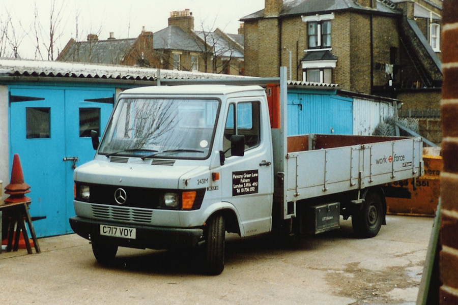 | Details: Another of the C-VOY registered Mercedes 307D trucks, 2431M is in the livery carried by several of the batch for their first few years. This featured large 'work force' lettering on the bodywork, with a smaller LRT Builders label, while the cabsides featured the Parsons Green Lane address. As this is the only photo I have of 2431M, I cannot say whether the livery was later changed. A couple of details of the vehicle are of interest (to me at least!). The locker below the bodywork seems to have been fitted on some (but not all) of this batch, and this one has had LRT Builders lettering applied. Just in front of this is what looks like an extendable support strut, of the type often found on demountable bodies. It is not very clear here, but also appears on several other photos I have of vehicles from this batch, both the dropsides and the curtainsiders. There is no sign of any support at the rear of the bodywork on this (or any other) photo, so I doubt that these were in fact demountable. Could it simply have been to support the vehicle while loading/unloading? Finally, and possibly connected to this, there is something orange in the body just behind the cab, which could well be a removable hoist. The location of this undated photograph is the small Junction Road premises in Upper Holloway. The houses in the background (with their distinctive buttresses) are on Monnery Road, which leads to the back entrance to Holloway Garage. | ||||