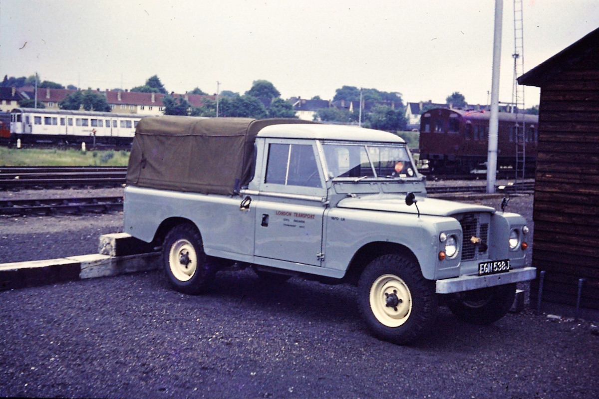 | Details: Land Rovers formed a very small part of the numbered service vehicle fleet, with a total of thirteen being bought between 1963 and 1974. Unique amongst these was 1670LR, a long-wheelbase example with open back and canvas cover. While most LT Land Rovers were supplied by dealers (mainly Mann Egerton or Henlys), 1670LR was listed as having come from Chipman Chemical Co. This is no doubt due to it having been fitted with weed-killing equipment, though there is no external evidence of this in the photo. New in December 1970, 1670LR was allocated to the Permanent Way Engineer at 'Acton', which may or may not mean Acton Works! Derek photographed it at Neasden Depot during an open day on 6th July 1971, and it was to remain in use until autumn 1980. Also visible in this view are trains of A-stock and 1938 stock (on the left) and a T-stock unit (on the right), presumably one that was retained for sleet clearance duties after the type was replaced by the A-stock in the early 1960s. | ||||