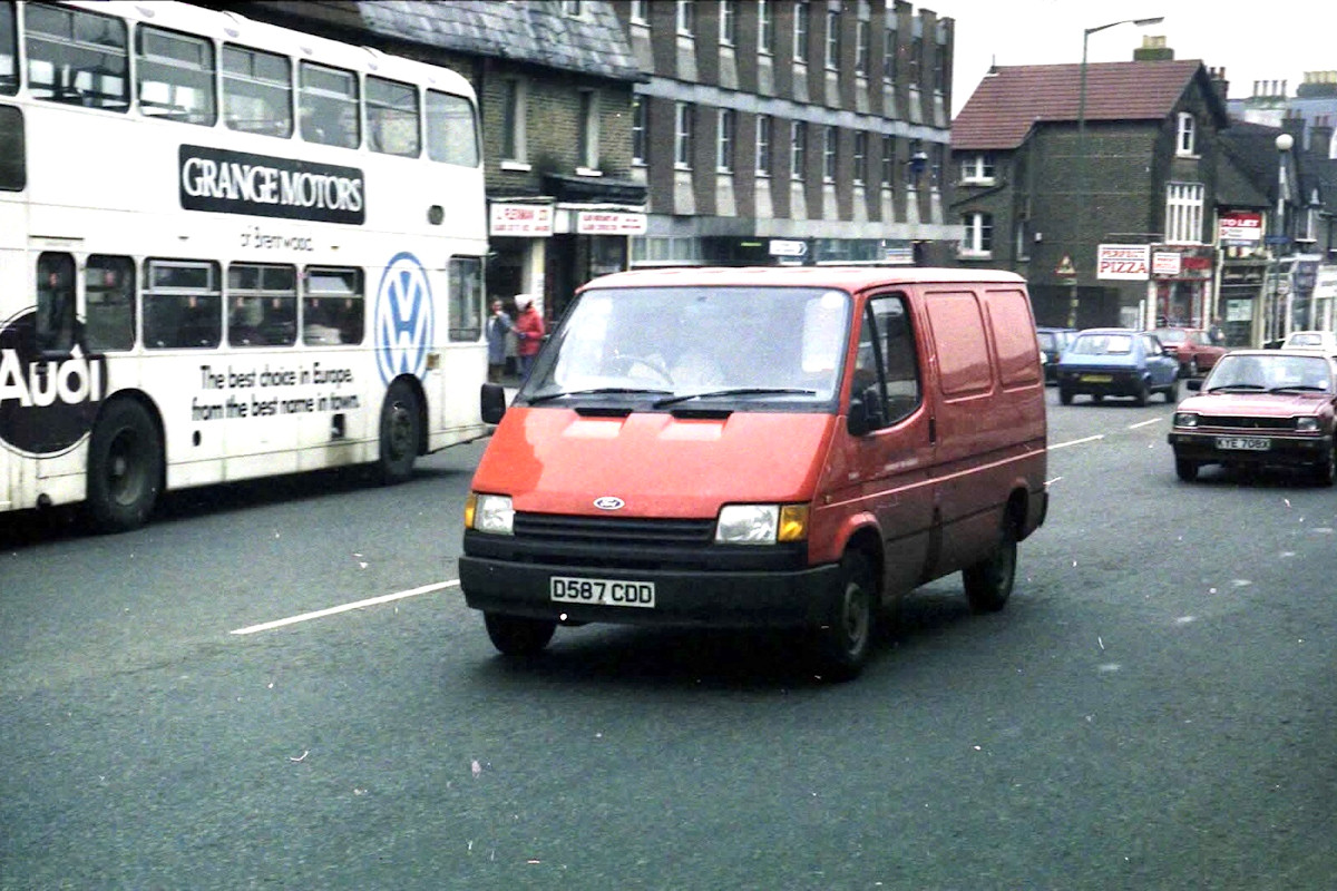 | Details: A couple of months ago I published a photo by Phil Hambling of a red Ford Transit Mk3 van in north London with an Eastern National Bristol VRT bus in advertising livery in the background. Well, its deja vu all over again! (Sorry if that pun sounds familiar. I see that I already used it about a year ago.) Actually there is even more of a coincidence, because the two Transits carry consecutive registration numbers. Seen passing through Barnet in March 1987, 3396F was only two months old. Allocation information for this van is rather sparse, partly because it only lasted for slightly under three years. It was leased for the Permanent Way Engineer and is likely to have been allocated (on paper at least) to Pelham Street, South Kensington. | |||