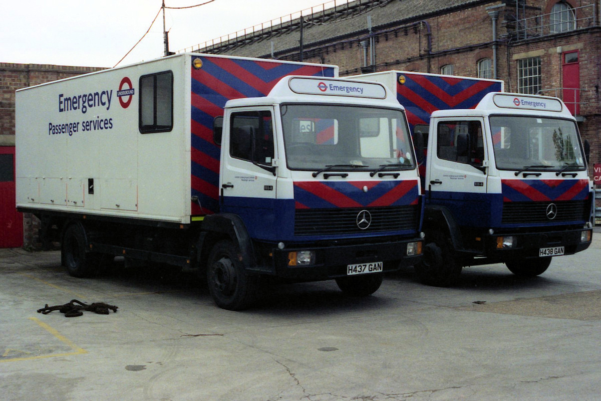 | Details: Mercedes-Benz 1114 demountable lorries 2495M and 2496M were seen at Ealing Common Depot in about 1991. Each is fitted with a Locomotors box body featuring a crew compartment at the front. It is believed that these two lorries were based at Ealing Common, though official documents state that they were acquired to replace Neasden-based Fords 2200F and 2201F, yet were allocated to Acton and South Harrow respectively. Note that neither lorry carries its fleetnumber. This appears to have been the case for most of their lives, with just one photo of 2496M taken in 1997 showing it with a number. Both lorries were withdrawn following the delivery of new Volvo FL6 demountable lorries in late 1998, although the existing bodies remained in use. | |||||