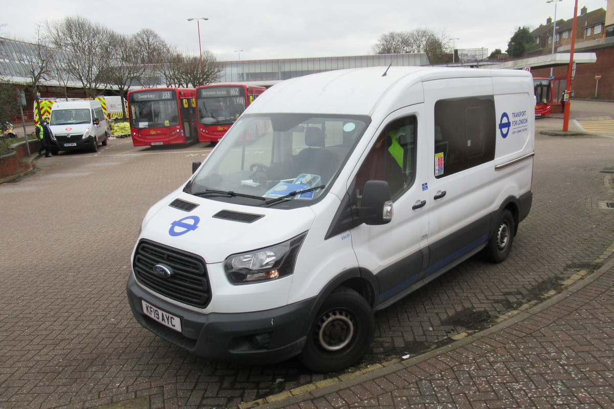 | Details: Another mystery solved, perhaps! Ford Transit Mk8 crew van 8863F was new in mid-2019. However, it was missed by our Acton watchers, so we were not sure of its livery. A couple of reports later in the year stated that it was in TfL white/blue, but it was then not seen again for some time. On 5th March 2021 it turned up at Eltham Bus Station, and luckily Ray managed to catch it. The reported livery had made me wonder if this van was allocated to the rump of the infrastructure services department (which seems to still make use of white/blue VW van 8267VW). However, Ray's photo suggests that it may be with Passenger Data. Their Vauxhall Movano minibus 8302V is visible parked in the background (along with several of the resident Incident Response vans). So, I am now going to speculate that the white/blue/red applied to LBSL vehicles from early 2017 (and carried by 8302V) has been dropped because it is too similar to the LUL livery. This would seem to be supported by the fact that the four Nissan Leaf cars new in TfL white/blue in autumn 2020 have been allocated to LBSL work. | ||||