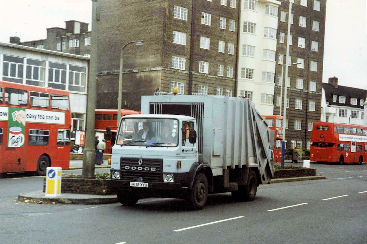 | Details: I suspect that many of you will recognise this location as being Brixton Bus Garage, which of course is not actually in Brixton! Taken in November 1986, this view shows Dodge Commando dustcart 2419D about to turn towards the garage, no doubt to empty their bins. Three of these lorries were delivered in March 1985, these being the last of the Commando type bought by London Transport. In fact only one more Dodge was taken (S75 dropside 2424F in late 1985), and the brand was soon to be dropped in favour of Renault. The Renault diamond logo was displayed along with the Dodge name for a while, as seen here. 2419D and 2421D were both withdrawn in 1990 following the arrival of larger Mercedes dustcarts. 2420D was kept as a reserve vehicle, lasting until 1996 and being the only one repainted to white/blue. The buses in the background are typical of the time, including three DMS Fleetlines and a single Routemaster. If you are interested in buses of this era, Phil's Flickr site is well worth a look. The album for Fleetline buses alone has 1,661 photos, most of which are LT DM/DMS types. | ||||