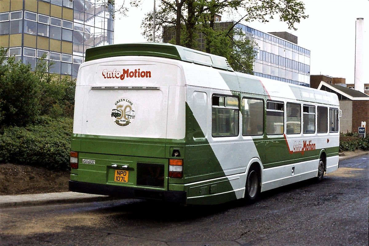 | Details: Also seen at Stevenage Garage on 17th May 1980, London Country's LN7 had been converted for a similar role to LT's SPB753 (which it was parked in front of). By the beginning of the 1970s the UK's bus manufacturing and operating industries had been nationalised and rationalised. Most bus builders were either owned by or had been absorbed by British Leyland, while most bus companies in England and Wales (apart from those in larger towns and cities) had become part of the National Bus Company (NBC). Leyland proposed replacing a variety of single-deck models with one new type, and planned to restrict the options and paint finishes available. The new type was called the Leyland National, and initially all were to be fitted with dual doors. London Country (LCBS) was one of the largest NBC companies, and they ordered 70 long (11.3m) Nationals. These were mainly intended for use on Green Line services, though the bus seats and dual-door layout were not ideal for this. In the event, Leyland bowed to pressure to offer a single door option, and only the first 23 LCBS buses came with dual doors, these being classified LN. The LNs, along with the single-door LNB (bus) and LNC (coach) Nationals, did not prove very popular with LCBS, although the company went on to successfully operate almost 500 of the shorter (10.3m) model. Because of all this, several of the long Nationals were taken out of use while quite young, and were thus good candidates for conversion to other uses. LN7 was rebuilt as a mobile information point and shop, emerging in spring 1980. That year saw several events to mark the 50th anniversary of the Green Line network, and LN7 - branded as InfoMotion - was prominent at many of these. It is not known how long the vehicle remained as such, though it seems likely it was out of use before the split-up of LCBS in 1986. Although LN7 is only a year younger than SPB753, it marks a watershed in single-deck bus design. SPB753 was a late example of the high-capacity single-deckers introduced in the 1960s (when one person operation of double-deckers was not permitted). Most such buses had been withdrawn by the early 1980s. LN7 represented a type that was to remain in production until the mid-1980s, and to be a common sight across the UK until the mid-1990s. | ||||