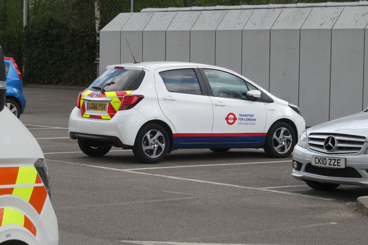 | Details: The five Toyota Yaris cars leased for LBSL in early 2017 and given white/blue/red livery have seen some allocation changes since. 8417T went initially to Eltham, then moved to Morden before it was a year old. It was seen in the yard next to Morden Station car park on 1st May 2021. I left this photo uncropped as it includes part of one of the VW Crafter vans allocated here. This shows the difference between the red/yellow chevrons applied to the rear of many service vehicles, and the orange/yellow stripes that are applied to the sides. | ||||