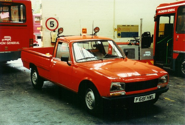 Details: Most of the Peugeot 504 Pick-Up trucks leased in the late-1980s were allocated to bus garages for engineering support duties. Un-lettered 3651P (F681HWL) was no exception and was photographed at its home base of Sutton Garage on 14th April 1991, in company with two DW-class buses. Note the garage sweeper, complete with London General logos, in the background.