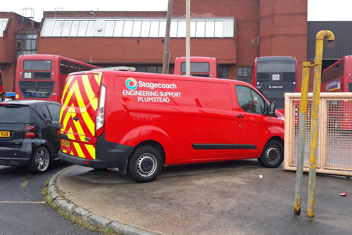 | Details: Stagecoach London's Plumstead Garage now has a new engineering support van. Ford Transit Custom van MJ20UVH appears to have been new in autumn 2020, though it was not positively identified until Bob photographed it outside its home garage on 15th May 2021. Ironically Ray also submitted a photo taken at the same place on the following day. This van has replaced YE15EEU, which had been notable for arriving about a year before further vans were delivered for the group's other garages. As such, can we expect to see more new vans later this year? Another perhaps interesting point is that the new van is low-roof, whereas all the earlier examples were high-roof. Finally, note the revised Stagecoach 'beachball' logo on the van, compared to the earlier version on the bus on the right. It always amuses me when corporate organisations announce new branding which seems to only minutely differ from that used before. To be fair, the new Stagecoach logo was part of a wider scheme, with the livery on their buses outside London being rather radically changed. | ||||