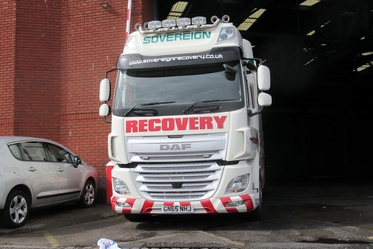 | Details: One more 'second appearance' for today, although it is actually a third helping. Sovereign Recovery's GN65NHJ is a DAF CF 2-axle truck with fleetnumber H128. Since it was last shown in 2019, the livery has been amended, with parts of the red chevrons on the front (across the grille and around the headlamps) removed. | ||||