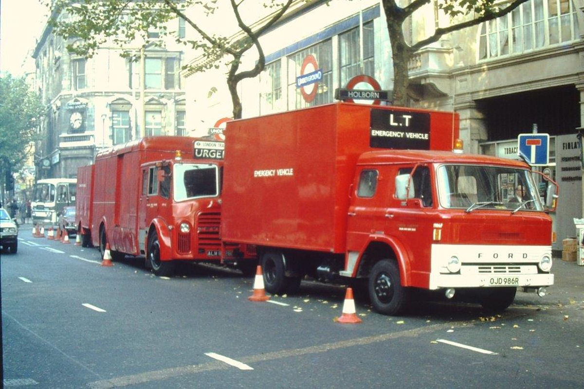 | Details: Back to Holborn in October 1978 and this photo shows the group of service vehicles parked nearest to the station in the aftermath of the derailment of an engineer's train. To the fore is a gleaming 1986F, a Ford D0710 new in late 1976. Initially allocated to Ealing Common, it spent a few months delicensed in 1977 (for reasons unknown) and transferred to Neasden in 1978. Six similar Ford D lorries followed in 1978-1980 to replace the Leyland Titans in the emergency role. These six had a revised design of crew cab, while the final four had an updated front grille design. Compared to the Titans and Traders, the large warning sign on the front was still a feature but no longer internally illuminated. Most of the Fords remained in service until replaced by Mercedes demountables in 1990. Behind 1986F is Leyland Titan 1279LD also from Neasden, while behind that is Ford Thames Trader 1282F (meaning that all three red Traders were in attendance). 1282F had by this time been converted into a Communications Vehicle, as evidenced by the additional white lettering on the bodysides. Unless there was something else tucked in behind 1282F, the last service vehicle in this photo is Morris Marina estate 1997M, this car being allocated to the Breakdown Foreman at (can you guess?) Neasden. | ||||