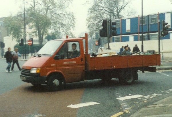 | Details: This photo has been included as it shows only the second Ford Transit Dropside taken into the numbered fleet (the first having been Mark 2 3355F). It is also the only LUL example reported to have carried red livery. 3529F (E961ELU) was caught at Baker Street in December 1987. | |||
