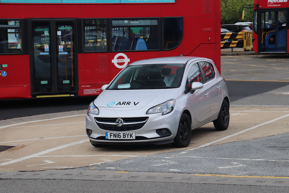 | Details: This Vauxhall Corsa car of Arriva London (or ARRV!) appears to be at its third garage. First seen working from Dartford when new in spring 2016, it soon moved across the river to Grays. It has now moved again to Palmers Green in north London, resulting in it regularly appearing at Edgware Bus Station, as seen here on 25th May 2021. Visible inside is a sign on the offside rear seat, presumably deterring passengers from using this, for the benefit of COVID-19 related social distancing. | ||||