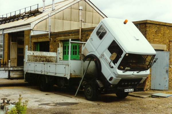 | Details: Forward control lorries are fitted with tilting cabs to permit access to the engine and gearbox, as demonstrated by Dodge Commando 2406D (A406SJD) at Chiswick Works on 13th August 1988. This dropside lorry featured a crew-cab and tail-lift and can be seen in a more conventional state here. | ||||