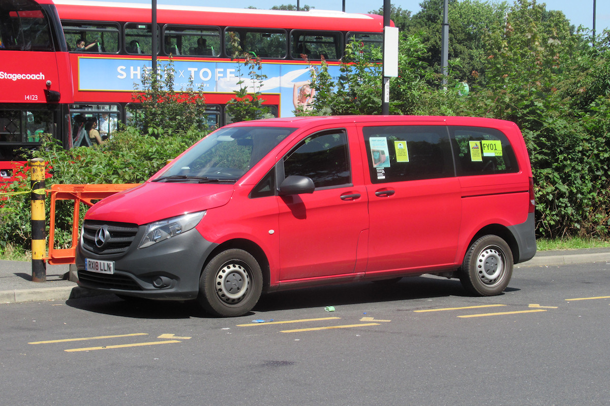 | Details: This photograph clarifies the situation with Go-Ahead London minibus numbering which I mentioned back in May. To recap, it would appear that Go-Ahead has allocated new fleetnumbers to its service vehicle fleet, one of the engineering vans being noted with ES11 lettering applied in the traditional positions. I then got reports of some of the numerous Mercedes Vito minibuses being numbered in the FVxx series, although it was not mentioned where the numbers were applied. It would appear that only the minibuses at Silvertown have been done so far, and the numbers are carried on a yellow label in the side windows. The company fleetnumber is in the box in the bottom right of this label, and is prefixed FV, presumably for Ferry Vehicle . A larger number is also shown, these being in the FY0x series, and believed to be Silvertown's own 'local' fleetnumbers. Recent observations suggest that Vito minibuses from other garages are still operating without company fleetnumbers. The Northumberland Park minibuses have 'local' fleetnumbers on window labels, while the two at Bexleyheath have properly applied local fleetnumbers BX1 and BX2. Ray photographed RX18LLN, FV16 (aka FY01), at Beckton Asda on 17th July 2021. The Stagecoach bus visible to the left is one of the growing number of electric-powered double-deckers now in use. 14123 is a BYD D8UR-DD with ADL Enviro 400 City bodywork (such evocative names they give them these days!). Visible in this view is the rear-facing video camera that has replaced traditional mirrors on many recent deliveries. The round object above that is believed to also be a video camera, one of several that are used to present a composited image of the vehicle's immediate surroundings to the driver. | |||
