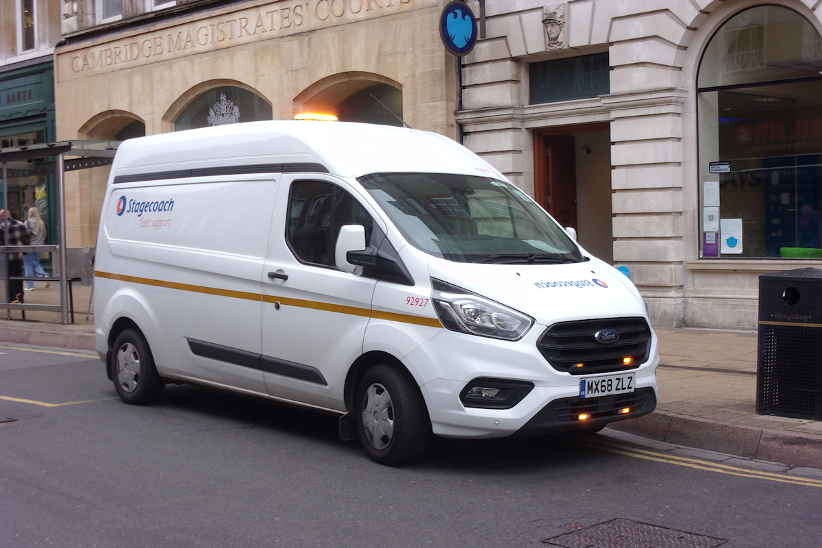 | Details: As will be fairly readily apparent, this is not a London service vehicle. Photographed in Cambridge on 30th June 2021, MX68ZLZ is a long-wheelbase Ford Transit Custom van used for 'fleet support' by Stagecoach East. It carries fleetnumber 92927, this being in the national Stagecoach series. It seems that most numbers starting in a 9 are assigned to ancillary vehicles, with various numbers in the 90xxx, 91xxx, 92xxx, 93xxx, 95xxx and 96xxx ranges being featured on London SVs. Numbers can be re-used when vacated by disposals, this accounting for the somewhat haphazard allocations. | ||