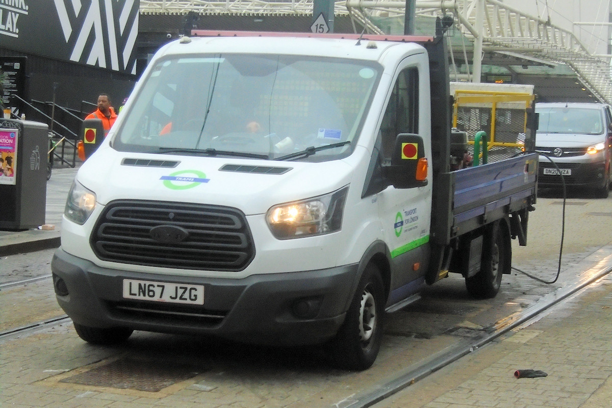 | Details: There has been a lot of maintenance work on the tram infrastructure in central Croydon recently, offering the chance to photograph some of the surprisingly large fleet of support vehicles. Seen outside East Croydon Station on 30th August 2021 was Ford Transit dropside truck 8566F, new in late 2017. This vehicle has a tail-lift, carries standard white/blue/green livery, and has lost its front Ford badge. | |||