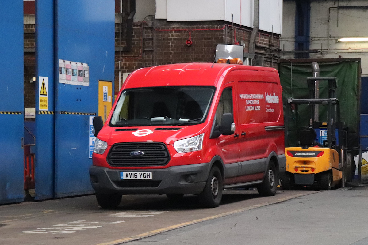 | Details: Although each of Metroline's garages has a Ford Transit Connect van allocated to it, larger vans can also sometimes be seen visiting. Ford Transit Mk8 AV16YGH was seen at Alperton Garage on 19th August 2021, perhaps there in connection with the winding-up of operations ahead of the closure in September. In this photo it was parked in the engineering section, with the pits behind the doors on the left. The fork-lift truck in the background is believed to be based here but, being unregistered and unnumbered, has not been included in the database. | ||||