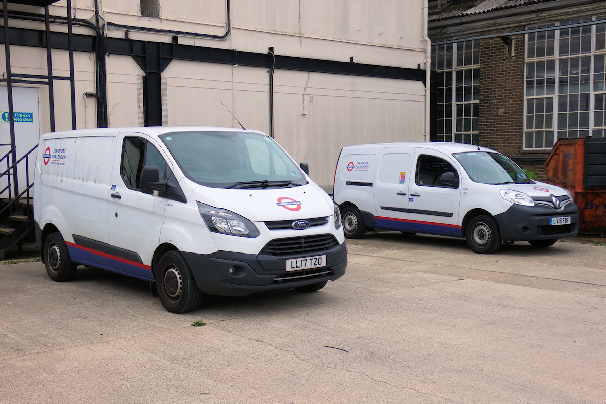 | Details: Two fairly common types in the LUL fleet are the Ford Transit Custom and Renault Kangoo vans. Seen at Acton Works on 11th September 2021 were one of each, 8486F being a SWB low-roof Transit Custom with the original frontal design, while 8627R is one of the longer Kangoo Maxi models, which usually feature cargo doors on both sides. | |||||