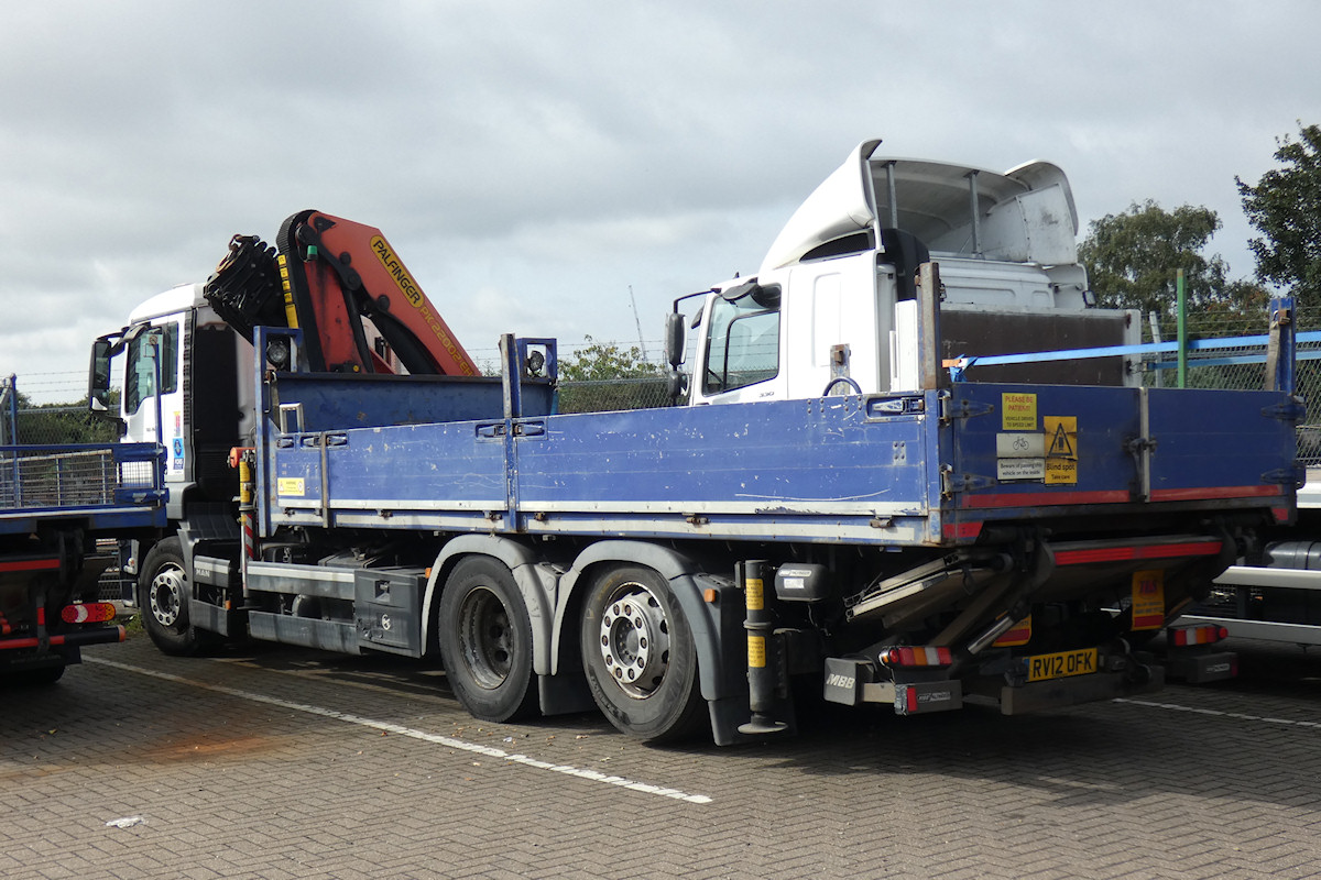 | Details: Although essentially a standard dropside lorry, MAN TGS RV12OFK is quite a complicated bit of kit, as this photo taken at Acton Works on 11th September 2021 shows. A large Palfinger telescopic crane is fitted, which neatly folds away behind the cab. When the crane is in use, stabilisers under the front and rear of the bodywork would be extended and deployed. The rear axle is of the lifting type, which can be raised when not required, thus saving wear on the tyres and mechanical parts. Finally, there is a fold-away tail-lift under the rear of the bodywork (to allow this to be used, the doors at the rear of the body are hinged at the side). Parked alongside was hired DAF flatbed lorry NC14NDC in unmarked white. | ||||