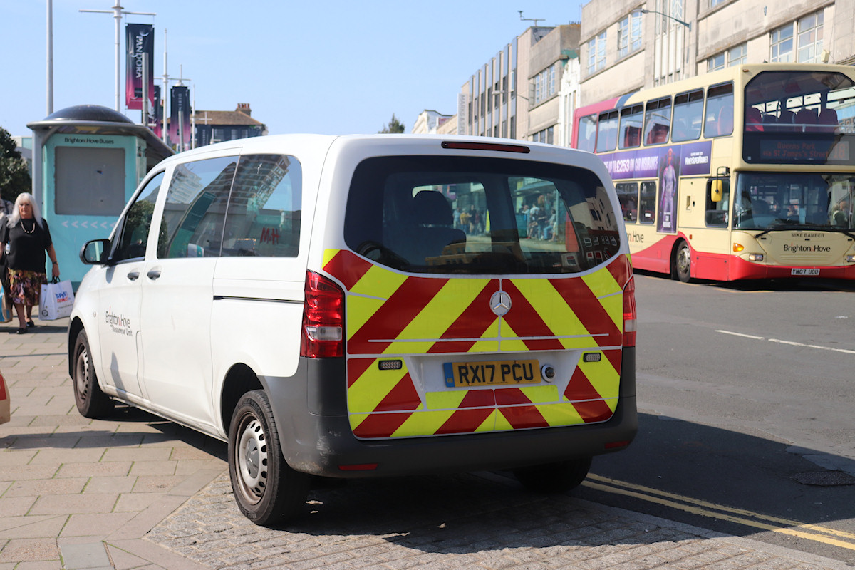 | Details: Mercedes-Benz Vito minibus RX17PCU was used as a crew ferry vehicle in unmarked white from a variety of Go-Ahead London garages between 2017 and 2019. It was also reported to be part of the associated Brighton & Hove fleet, and this photo suggests that it has now made the coastal town its permanent home. Taken on 22nd September 2021, it shows the Mercedes at the bus stops on Western Road (outside the Churchill Square shopping centre). The role of the vehicle appears to have changed as it is now fitted with rear chevrons, warning lights and 'Response Unit' lettering. Passing on the other side of the road was an East Lancs Omnidekka bodied Scania, a type that has recently disappeared from service in London. Unlike many bus companies outside of London, Brighton & Hove has always used the same basic livery, even though the layout has been somewhat modernised. The current Brighton and Hove was formed in 1985 when the Brighton services of National Bus Company subsidiary Southdown were split off in preparation for privatisation. However, until 1969, Brighton and Hove had been a distinct company, and used a livery of cream and red. | |||