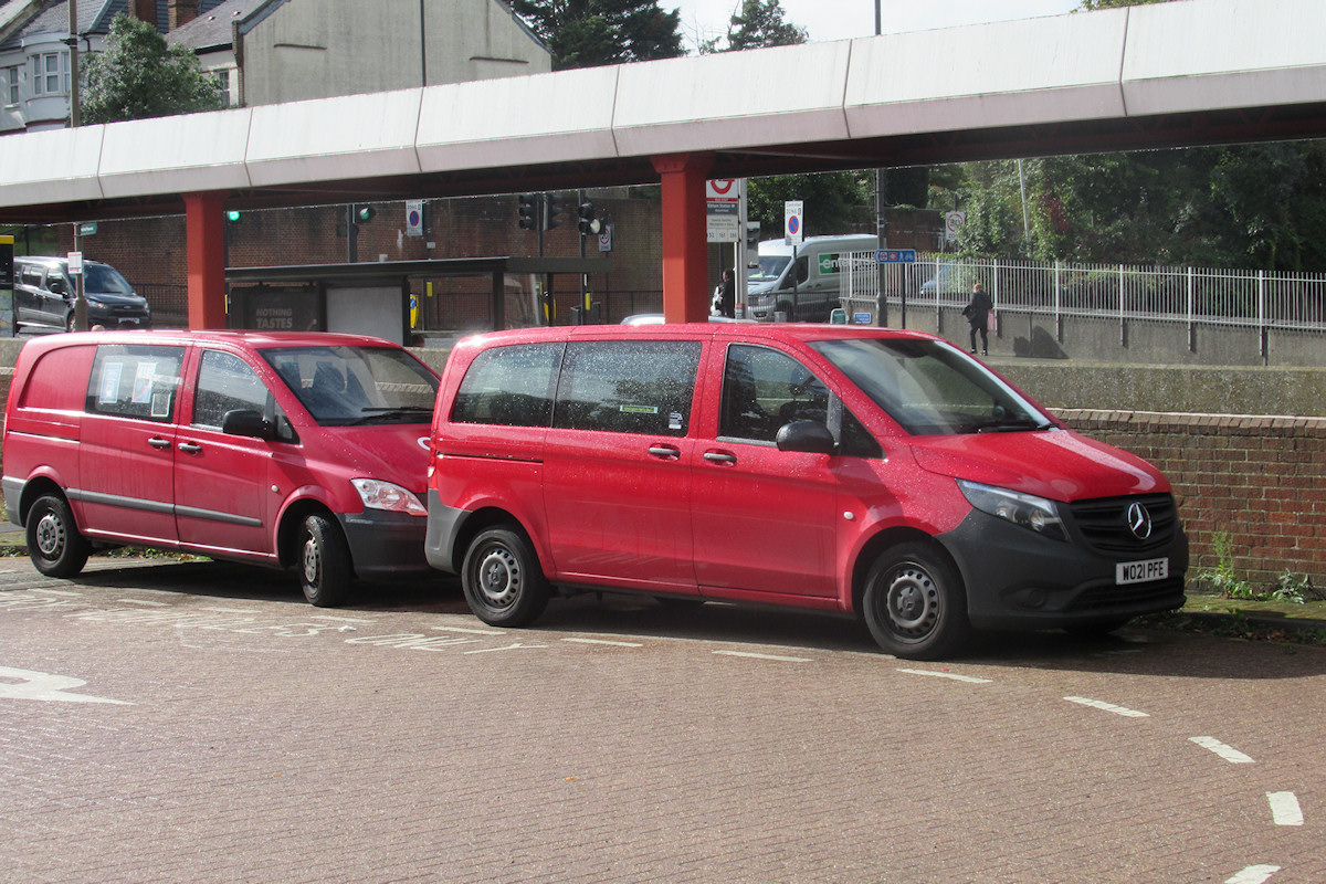 | Details: Ray found a new Mercedes Vito minibus at Eltham Bus Station on 28th September 2021. Route 286 (operated by Morden Wharf Garage - MG) had recently switched its crew changeover point from Vanbrugh Hill (Greenwich/Charlton) to here and Ray pondered whether WO21PFE was running from MG. However, a closer look at the photo showed that the minibus had a label in the offside passenger window stating 'Orpington Ferry Bus'. Note that there are no notices about facemasks or social distancing, and no tape has been applied to stop the offside passenger door from being used. Both of these features can be seen on the Vito crew van parked behind, this being RK64OVH, also from Orpington. This batch of crew vans has now been in use for seven years and early replacement seems likely. | |||||
