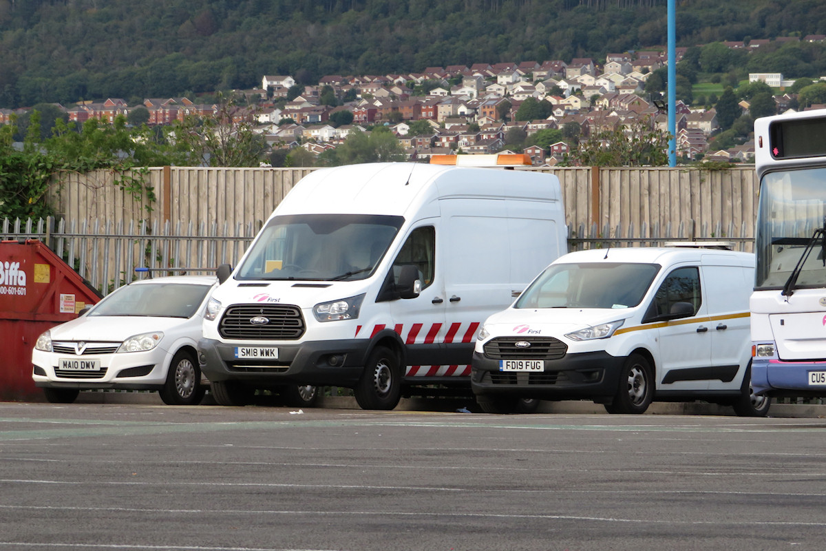 | Details: Andrew headed even further west in September 2021, into the territory of First Cymru. I believe this operator evolved from the National Bus Company subsidiary South Wales Transport. Seen at their Port Talbot garage on the 22nd were two Ford service vehicles, and an unmarked Vauxhall van that may also be in use with the company. Ford Transit Mk8 van SM18WWK in the centre has red chevrons around its skirt, and similar SM18WWN and SM18WWP were seen at garages in Swansea and Bridgend respectively. FD19FUG on the right is a Ford Transit Connect van with a low-profile light-bar and reflective side stripe. | ||