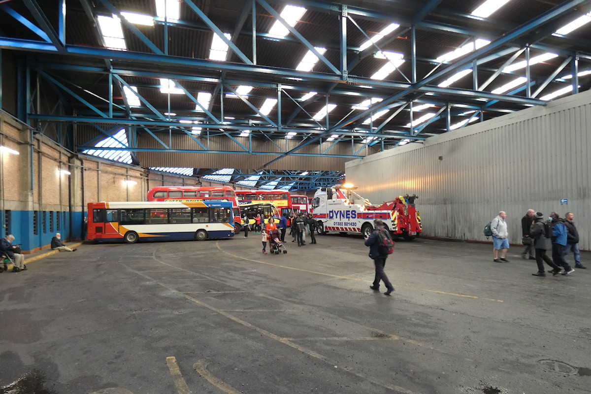 | Details: An open day was held at Stagecoach London's Plumstead Garage on 30th October 2021, marking the 40th anniversary of the original opening of the facility. The garage was built to replace smaller premises at Plumstead and Abbey Wood, and was originally intended to be called Thamesmead. Although built on a large 'brown-field' site, the design has a curious footprint and internal layout. It is somewhat like a letter C, with buses entering at the bottom and leaving at the top. The middle of the 'C' is occupied by offices and five different engineering areas, of which four have pits to enable work on the underside of buses. This photo was taken at the most westerly point inside the garage, looking north-east towards the (out of sight) exits. An array of (mainly) preserved buses was on display in this area, while some service vehicle interest was provided by the presence of a Dynes recovery vehicle (more on which shortly). The 'wall' on the right is part of a long 'shed' containing two double-length pits, though the doors at each end were unfortunately closed. One benefit of the layout is presumably that most vehicle movements inside the garage are generally always 'one-way'. | |||
