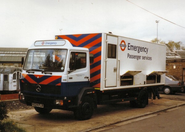 | Details: An interesting shot of Mercedes-Benz 814 demountable truck 2492M (H224FLB) taken at Morden depot in 1990 showing the equipment cupboard doors open. | ||||