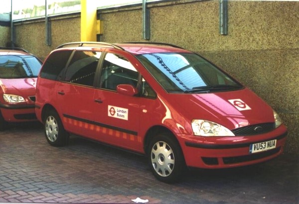 | Details: As well as a fleet of 15 Vauxhall Zafira estate cars, 4 broadly similar Ford Galaxy cars were leased for LBSL use in late 2003. Found at Uxbridge bus station in May 2004 was VU53NUA. Unlike the Zafiras, one of which is parked behind, the Galaxy cars do not carry fleetnumbers. | ||||