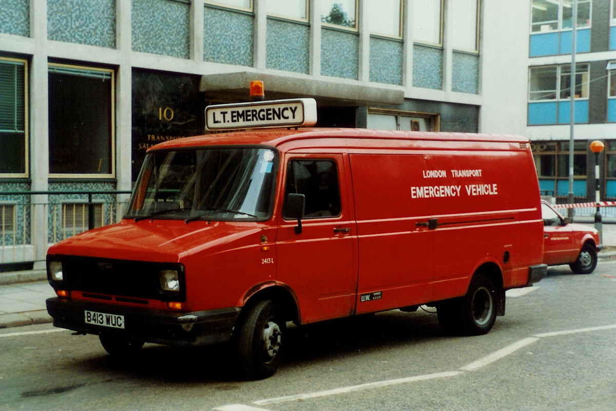 | Details: Seen parked on Melton Street (close to Euston Station) during an incident in the mid-1980s, 2413L was one of a pair of Freight Rover Sherpa 350 long-wheelbase vans allocated to the Signals and Electrical Engineer at Lillie Bridge. As can be seen, the vans had large Emergency signs mounted above the cabs, and they were used from 1984 until 1990. Although the date of this photo was not recorded, it could have been during the same flooding problems when Kim Rennie photographed service vehicles 3210B and 3409F. In fact, the Vauxhall Astra estate car parked beyond 2413L could well be 3210B. Although the larger Sherpa van models were only slightly bigger than a Ford Transit, they appear to have crossed a line in terms of purchasing policy. After 1982, all vehicles up to and including Ford Transits were leased and given fleetnumbers in the 3xxx series. Anything larger (including 300-series Sherpas and Dodge S-series vans) were purchased and numbered in the 2xxx series. | |||