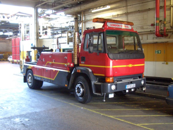 | Details: The excuse for showing yet another picture of London General's Leyland Freighter bus recovery truck (formerly 2415L (B731XJD)), is that it now carries yet another different livery! This view was taken at Putney garage on 31st May 2004. Not previously noticed was the fact that this vehicle had recently reverted back to its original registration, having carried VLT46 for a few years. The ex-Routemaster number was later used on London General's new Volvo recovery truck. | |||||