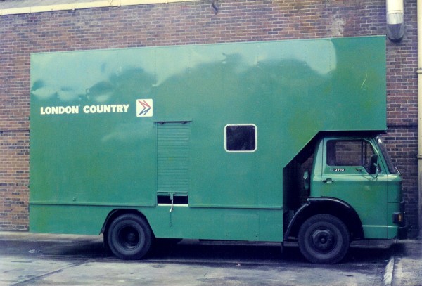 | Details: London Country inherited four of the five Ford Trader tree-lopping vehicles from London Transport in 1970. In 1979 the bodies of two of these were transferred to a pair of new Ford D0710 chassis numbered 34F and 35F. Then in December 1984, these two were given new bodies to a similar though plainer design. This view of 35F (BNJ92T) taken at Hemel Hempstead Garage on 27th June 1985 shows the offside access door and the London Country lettering and NBC logo. | |||||