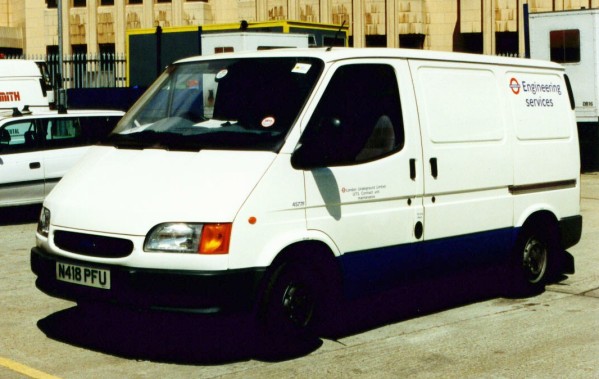 | Details: As of mid-2005, about 800 Ford Transit vans havd been leased by CDS since the numbering series for such vehicles was introduced in 1982, and this example photographed at Lillie Bridge is about as standard as they come! 4577F (N418PFU) was leased in 1995 and lettered for London Underground Limited UTS Contract and Maintenance. In the background can be seen two of the demountable bodies that feature small crew-cabs and drop-side rears. | ||||
