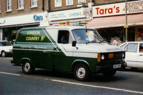 | Details: Ford Transit van HUF517V had been numbered 44F when with London Country Bus Services. After September 1986, it was part of the London Country North West operation, and had been repainted in their new green and silver livery by the time it was photographed in Edgware on 20th May 1989. Note the scroll lettering on the side, and the plate on the radiator which appears to read Willy's Recovery Van! | ||||