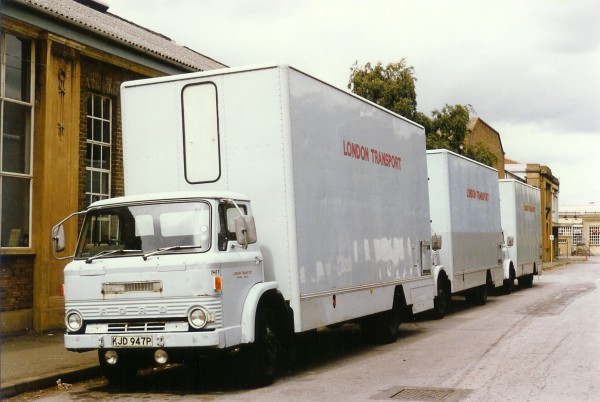 | Details: This view of three of the four Ford D uniform issue vans highlights the slab-sided appearance of these particularly tall vehicles. Nearest the camera is 1947F (KJD947P), new in 1976. The location is of course Chiswick works, on 13th August 1988. | ||||