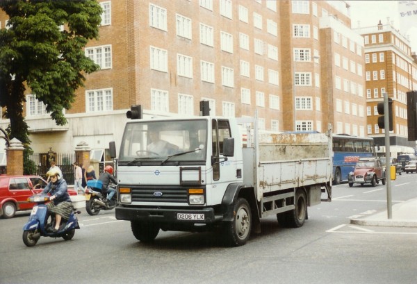 | Details: Ford Cargo dropside lorry 2437F (D206YLK) was one of the heavier models (in this case a 1011) as revealed by the wider mudguards. When it was photographed at Holland Park on 17th May 1989, it had acquired the short lived blue-striped livery. | |||