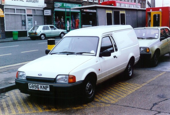 | Details: Parked in the bus station at Hounslow on 24th June 1991 was Ford Escort van 3911F (G896KNP). A number of leased vehicles carried white livery at this time, although the white and blue livery was soon to become standard. | ||||