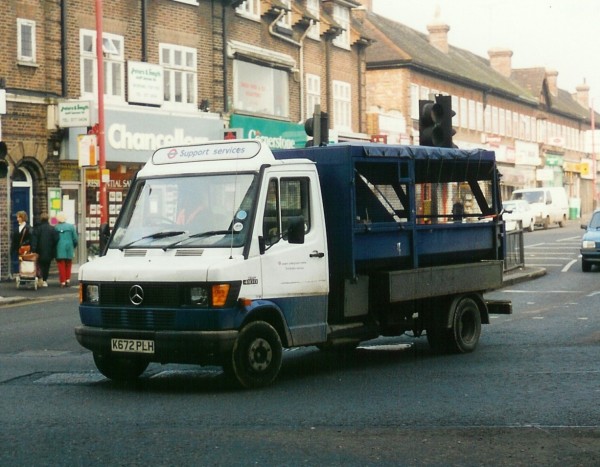 | Details: 2504M (K672PLH) was a Mercedes-Benz 410D caged truck used for the collection of bagged rubbish from underground stations. New in November 1992 it was seen passing Hounslow bus station on 19th February 1994. | |||