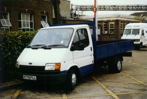 | Details: Ford Transit dropside 4013F (H779FLL) was new in November 1990 and was photographed on the last day of that month at Acton works. It carries the newly introduced LUL livery but it so far devoid of lettering. Parked behind is one of the four anonymous-looking Mercedes 310 bullion vans that were used to move cash around the London Transport network. | ||||