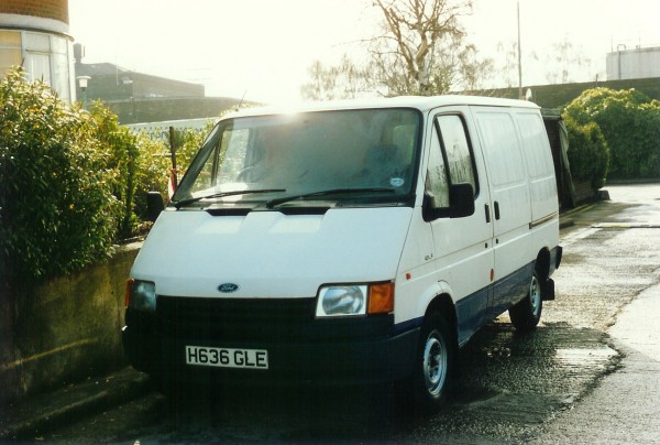 | Details: Gleaming in the sun at Acton Works after a shower on 2nd April 1993, 4014F (H636GLE) was a standard SWB low-roof Ford Transit van that had been delivered in January 1991. Note that no lettering is carried other than the fleetnumber. | ||||